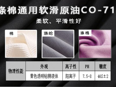 涤棉通用软滑原油CO-711是中等分子量的自乳化三元嵌段硅油,赋予织物极好的柔软、平滑性与稳定性。