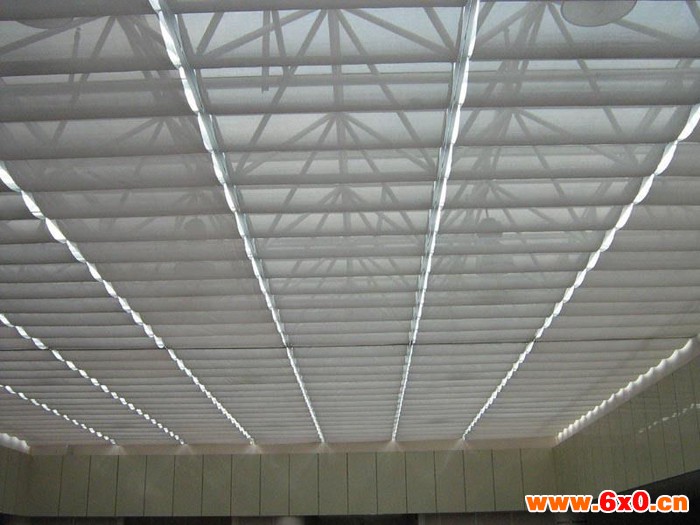 折叠式天棚帘,可用于商场,,学校,、商厦、宾馆、写字楼、等大型采光顶也可用于住宅阳光室、花棚、玻璃阳台等处调节遮阳、保持室内适宜温度,避免强光辐射,采光效应。