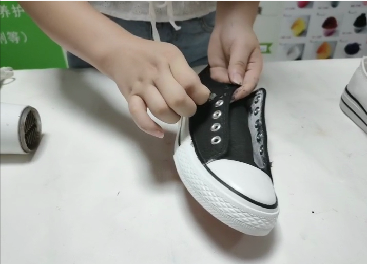 第三布:用刷子蘸取调配好的改色剂,均匀的刷涂在帆布鞋上,浅色鞋改深色鞋一般刷涂一遍就可以了。刷涂好后自然风干即可,如果用风筒吹干也需要再静置三小时左右。