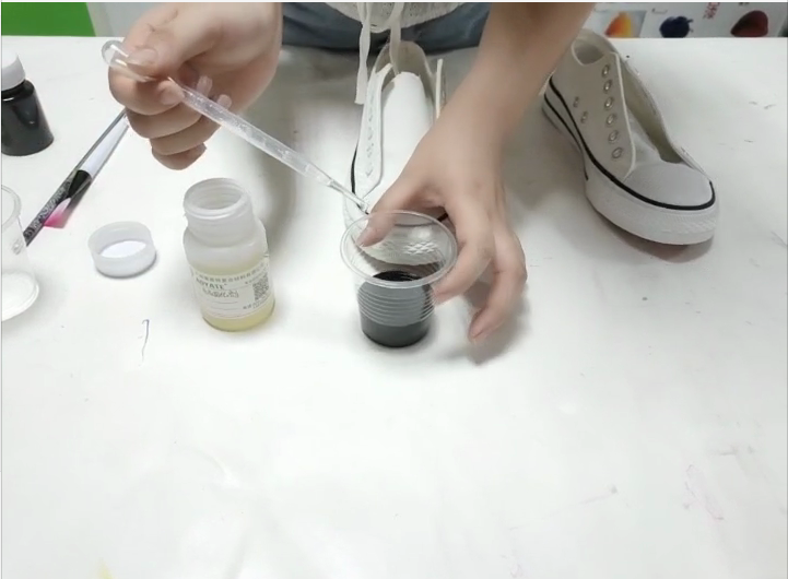 第二步:用滴管滴取3滴布衣固化剂于布艺改色剂中,均匀搅拌。这里需要注意的是添加了布衣固化剂的改色剂要立即使用。不可储存。所以大家在用的时候需要注意用量,以免造成不必要的浪费,一般80ml的布艺改色剂可以改一双帆布鞋。(固化剂的添加量直接的影响帆布鞋的柔软度和色牢度)