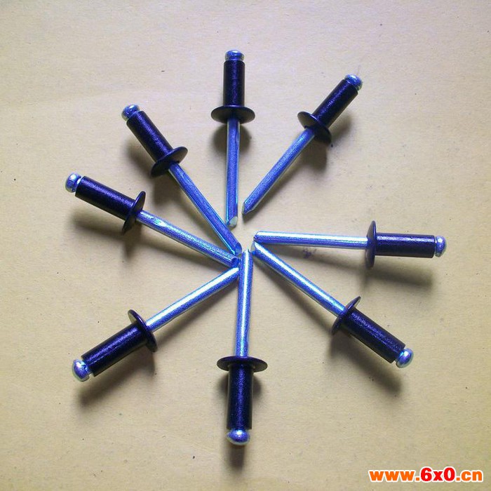 10、铆钉:由头部和钉杆两部分构成的一类紧固件,用于紧固连接两个带通孔的零件(或构件),使之成为一件整体。