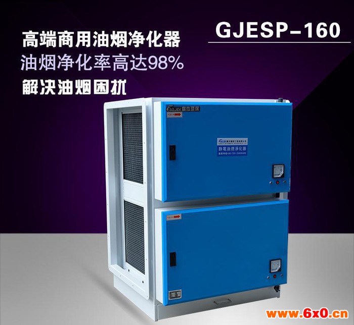 1、本产品采用静电净化和机械净化的双重原理,净化电场采用串联式多元组合方法,可高效捕集不同粒径的油烟粒子,从而达到净化效果。