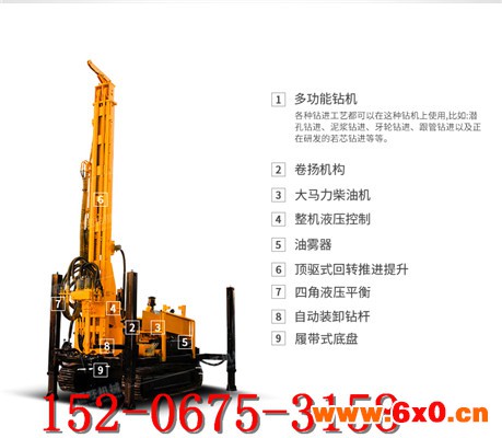1.该钻机采用工程履带,液压步履底盘,方便,较为适合平原,高原,丘陵等地貌。底盘设有4个支腿,钻探施工中钻机振动小,稳定性好。