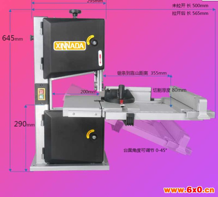 台式木工带锯机主要用于将大带锯锯解的各种板材、方材及树皮在剖成薄板材及各种规格的成材或横锯小径原木,锯轮直径为:800-1200mm。此类锯机的构成基本上与大锯机相同,仅仅进给装置有较大的区别。可以作为由大带锯组成的制材生产流水线中主力小带锯机。有的锯机,若将平台卸下配以进料跑车也可以作为制材大带锯使用。