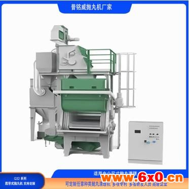 履带式抛丸机的铸件运载装置,是由一对圆形端盘(或带支撑环)和一条履带组成,形似上部开口的滚筒。工作时,履带转动,使带上的铸件不断翻动,并接受上方抛丸器的抛射。履带式抛丸清理强化机是根据用户要求设计的一种新型抛丸清理设备,用于铸件及锻件、小型圆弹簧、轴承等工件的清理强化。本设备抛丸量大,密封性好,清理效果、生产效率及除尘效果有较大的提高,使用轧制Mn13室体护板,维护费用减少了约60%。通过抛丸清理强化,不但可以去除工件表面的锈蚀、氧化皮、铸造后的型砂等,还可以降低工件的内应力,提高工件的抗疲劳强度。本机可单机使用也可配线使用,具有较高的清理效率。工作过程为连锁启动一上料一进人抛丸室一关门一抛丸器起动一工件翻滚一丸料门开-抛打滚翻工件一丸料门关一门开一工件退出抛丸室一由输送机输送一上卸料可同时进行丸料循环。它的工作原理如下:在清理仓内加入规定数量的工件后,大门关闭,机器起动,工件被滚简带动,开始翻转,同时抛丸器高速抛出的弹丸形成扇形束,均匀地打击在工件表面上从而达到清理的目的,抛出的弹丸及砂粒从履带上的小孔,流入底部的螺旋输送器上,经螺旋输送器送入提升机内,由提升机提到分离器中进行分离。含尘气体由风机吸送到除尘器中过滤后,变为清洁空气,排人大气中,灰尘经空气反吹落入除尘器底部的集尘箱中,用户可定期清除。废砂由废料管流出,用户可回用。丸砂混合物由回用管回收进入室体,待分离器分离后再回用。抛丸器的布置经过计算机三维动态模拟,所有布置的角度、位置均由计算机设计确定。在照顾所有需清理工件的基础上,尽量减少弹丸的空抛,从而提高了弹丸的利用率,减少了对清理室内防护板的磨损。抛丸清理室的室体系焊接结构,由室壳、室顶及室内防护等部分组成。室壳底部有螺旋输送器,内部装有履带及其传动机构,端部装有端盘,内部采用耐磨护板防护,室顶固定抛丸器。安全抛丸器设计了简单可靠的安全防护装置,当设备进行检修、润滑等操作时,该装置可保证进人清理室人员的安全。