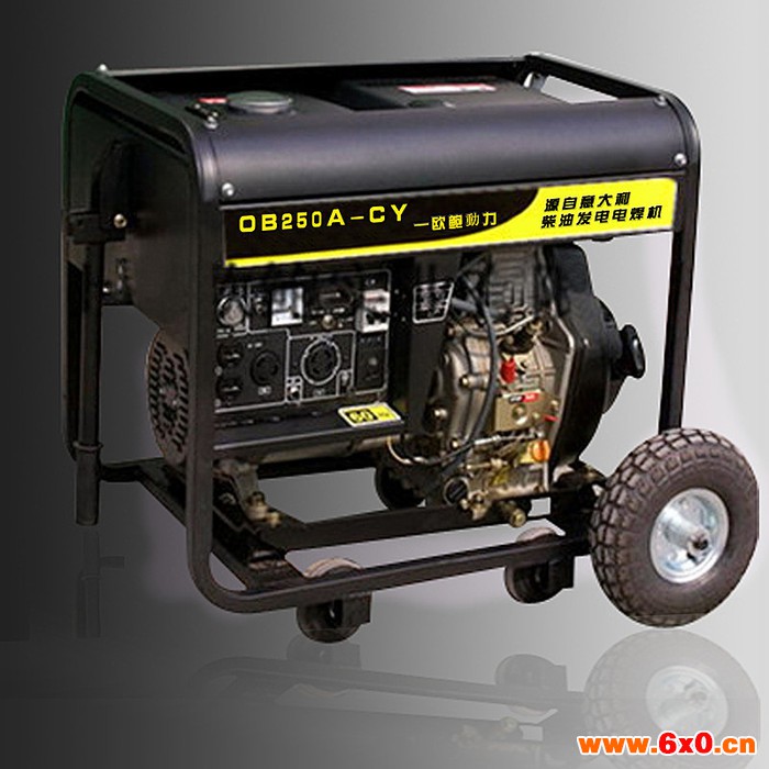 欧鲍发电电焊机,有汽油和柴油两款,各有其优点,电流有直流和交流,是发电机和电焊机连体的设备,一款新的焊机设备,且附带5千瓦的辅助电源,可所以 电焊作业的同时进行其他照明灯工作。机器结构:发动机与电焊机一体的机器,发电机通过动弹发出电流直接带动焊机进行工作,一般有汽油动力柴油柴油动 力两款常用。附带5kw小功率辅助电源,能够带动照明等小功率设备。使用更加便捷。