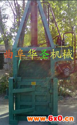 液压打包机包括支架,支架带有底板和前后侧挡板,支架上安装有千斤顶,千斤顶带有活塞杆,活塞杆右端连接有竖直的推料板,推料板右侧面连接有推料板条,相邻推料板条之间的空隙为板上穿绳槽;支架上面右部带有压料上挡板,压料上挡板左侧的支架上面带有进料口;前后侧挡板右侧的支架上分别固定连接有前后侧挡条,相邻侧挡条之间的空隙为穿绳口;