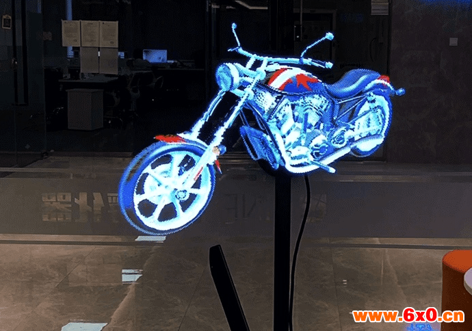 全息机,LED灯条旋转显示,利用人眼暂留原理,形成图形、动画或者视频,因其无边框和背景,让用户感觉图像是立体漂浮的,故称全息机或全息扇。