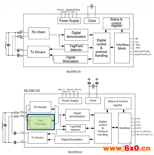 图1. MLX90130/2功能框图 MLX90130/MLX90132是一个高性能的13.56MHz HF RFID读卡器IC,包括一个集成的模拟前端(AFE),内建符合ISO15693 , ISO14443A / B , ISO18000-3模式1标准的数据帧引擎。 MLX90130为OEM和系统集成商提供制造高可靠,一流的,高性能的RFID设备的能力。 利用高级位和帧解码功能,MLX90130/32的数字信号处理模块可以处理从API至物理层的低协议层。它包括一个基于子载波检测和可编程位/符号编码器/解码器的数字解调器。它还编码和解码启动和停止位,奇偶校验位,额外保证时间(EGT),帧的启动和停止(SOF/EOF)以及CRC。其256字节的缓冲器允许对于整个RFID帧进行缓冲。SPI/UART通信端口保证了与主要微控制器的简易对接,特别是对于那些低成本产品。 另外,MLX90130/32的双驱动架构仅需要最小数量的外部支持元件,并允许发射器为适当的天线负载提供高达70mW的RF功率。所传输的功率可适用于大多数短距离至中距离的应用。 MLX90130采用5x5mm QFN封装,工作温度范围在-40至+105 °C。可以立即提供样品。 独有标签和场检测功能显著降耗 对于移动设备,功耗一直是一个永恒的话题,迈来芯在中国的代理商深圳市世强先进科技有限公司(简称:世强)市场经理余彪先生特别指出。“标签和场检测功能是MLX90130/32所独有的功能,MLX90130/32为支持NFC嵌入了增强的标签和电磁场检测功能,实现了在RFID读卡器配置和NFC模式下的显着降耗。MLX90130/32的功耗在同类产品中是最低的。” MLX90130/32是基于高频电磁场的振幅变化来侦测正在接近的标签。一个金属物体移近或远离天线足以影响高频电磁场的振幅。如果对象在该高频频率成为一谐振电路,对高频电磁场的振幅影响更大。 为了降低功耗,MLX90130/32利用极短的高频电磁场脉冲,检测物件在天线前方对电磁场振幅做成的变化,其余时间均处于睡眠模式。如下图2所示为标签检测的工作模式。