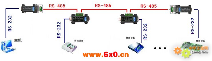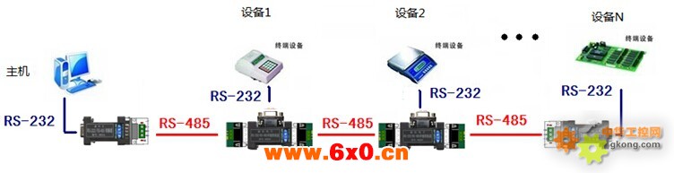 482应用与RS-485多机通信的典型接线图。可见不限距离(1200米×N)、不限节点数(N)。可以看出,使用了482的RS-485总线布线极其简单。zui远两端可以用48,也可以用482.