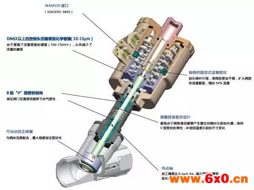 先进的阀腔设计,比普通角座阀流量大30%,流体流态更好;360度自由旋转,执行器采用加厚工程塑料,安全可靠;阀颈采用双向自调节契形特氟龙(PTFE)密封,完全避免脏物导入;阀杠特别固定处理,并自动校正位置;内部元件自润滑,免维护;附件易连接,备NUMUR连接座。