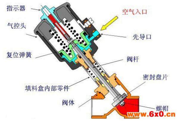 密封材质均采用碳石墨填充PTFE。阀杆上部有密封套;中部为截留密封的V型密封套用于密封气源,这些密封可根据弹簧自调整;下部是OMAL的特别处理方案,采用不规则刮板式密封,保证阀杆无杂质。