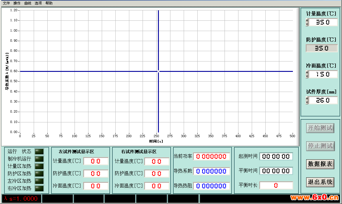 在“联机”状态下,点击菜单中的“导热系数检测”如果系统成功启动,则进入图2所示的界面。