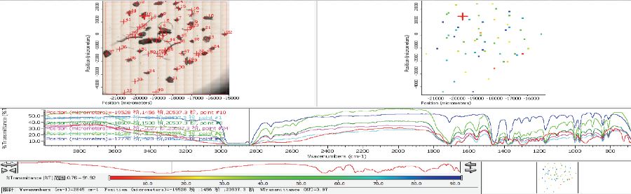 第二种方法是,选择连续点测试。Mapping面扫描测试虽然很好,但是由于微塑料样品的特殊性,形态各异,大小不均,因此有重点的选择各个样品的连续点测试是一个很好的选择。如图六是58个微塑料样品的连续红外测试结果,根据测试结果我们可以找到每个微塑料的红外谱图,进行定性测试。