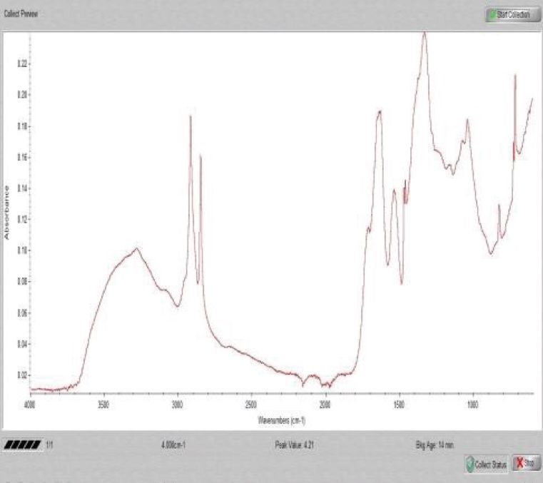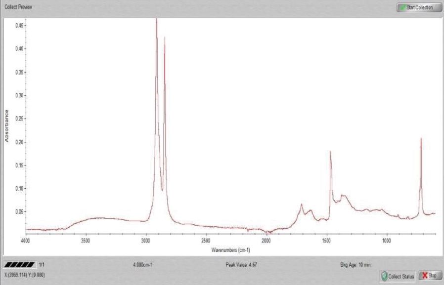 海水中的微塑料样品长期受到环境的腐蚀,采用ATR测试时,测试出的样品谱图常常是混合谱图,如图二中微塑料样品大约1mm,预览谱图显示为PE塑粒,从红外谱图中可以看出有少量杂质的吸收峰存在,这是由于样品表面附着微量的微生物且包裹一些无机盐的原因引起的。