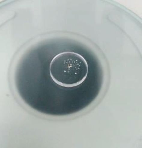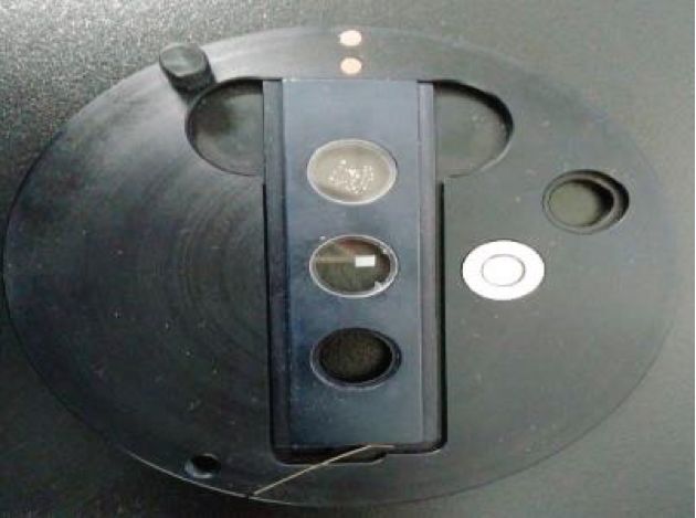 将剩余的微小微塑料样品转移到全部转移到13mm直径的KBr盐片上,由于样品比较小转移过程要非常小心,以免样品崩落。如图四所示,将转移好的样品放置在40倍体式显微镜观察,可以看到形态各异的微塑料样品,让后将KBr盐片放置在样品盘中,等待测试。