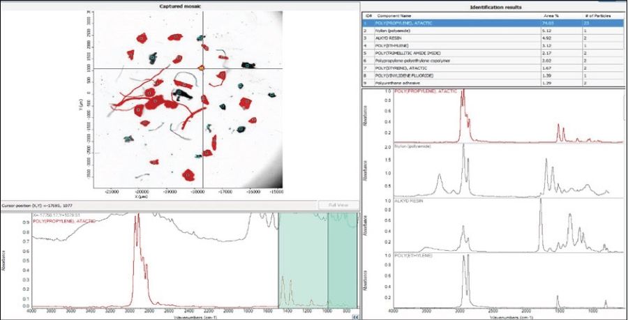 第三种方法是采用Thermo Scientific™ OMNIC Picta软件中的Wizards向导功能直接进行微塑料样品连续测试。Wizards向导功能可根据样品的颗粒度大小自动设置每个微塑料的光阑大小,然后根据Wizards向导提示逐步完成样品和背景的采集,谱库检索,最后根据谱库检索的定性结果给出微塑料中各个种类所占的面积百分含量。如图七选用Wizards向导功能测试多个微塑料样品的结果,谱库检索结果显示测试区域中的微塑料样品,聚丙烯颗粒占检测区域面积的70%。