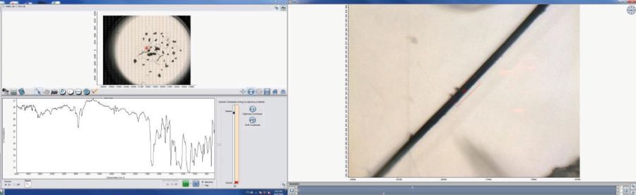 显微红外进行微塑料测试的方法有很多种,推荐采用透射。反射测试可以用,但是反射谱图由于受到样品颗粒度大小,样品表面反射效率等影响,红外谱图个体差异比较大,对于非专业测试人员来说谱图辨识困难,因此推荐透射测试。透射测试时可以选用三种方法,第一种方法是直接根据微塑料样品的红外预览谱图,快速给出定性结果。如图五所示,实时动态预览测试及预览谱图检索功能,可以实现快速微塑料样品的定性测试。