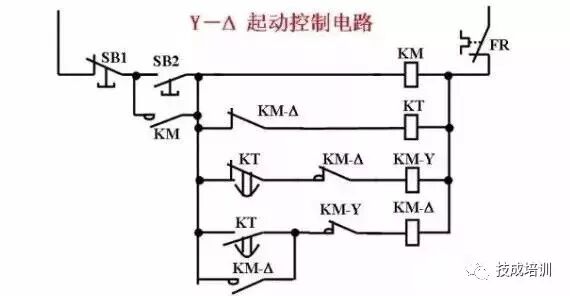 按下启动按钮SB2,主回路电源启动,KM线圈得电,其常开触点闭合,实现自保持,SB2复归;下面的时间继电器线圈回路和KM-Y线圈回路也接通,这时Y型启动已经实现,通过时间继电器时间的整定,Y型回路的时间继电器NC(常闭)触点得电后要延时打开,使Y启动保持住,而△回路KT的NO(常开)触点得电后要延时闭合,使得△型回路不得电。