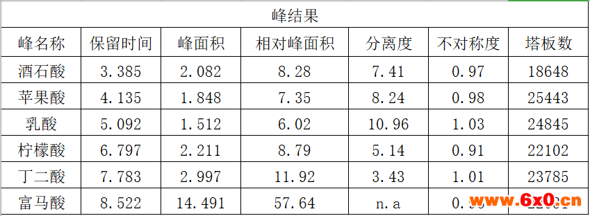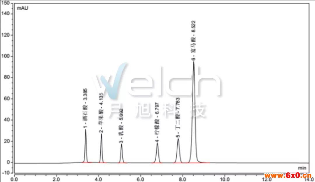 GB5009.157-2016国标食品中有机酸的测定,使用月旭Ultimate® LP-C18(4.6*250mm,5μm)柱,各有机酸分离效果好,可用于此标准的含量测定。