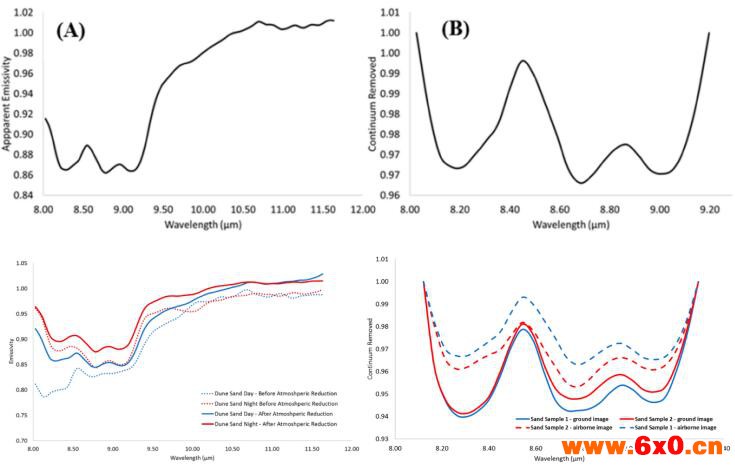 上图(A)实验室沙丘表观光谱图,(B)实验室石英光谱图;下左图为沙丘的昼夜光谱图,下右图为地面和机载石英光谱特征曲线的比较。高光谱Aisaowl LWIR图像能够绘制表面石英含量,并与实验室测量良好匹配(R2 = 0.88)。