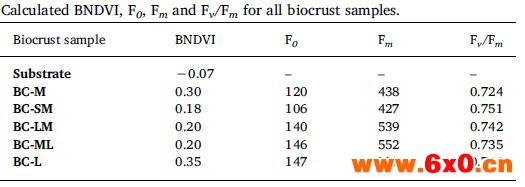 下表为5种不同生物结皮的多光谱BNDVI和叶绿素荧光参数Fo、Fm、Fv/Fm数据。