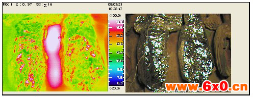 一部壁画史,是一个民族和国家精神文明与物质文明兴衰的形象记录,空鼓是造成壁画脱落,危害壁画保存安全的重要因素,造成壁画空鼓和损伤的原因是多种多样的,利用红外热像仪可以方便地检测壁画空鼓状况及对空鼓灌浆效果的评价。红外热图上反映的颜色非单一均匀,通过将红外热图上的颜色异常区与可见光数码照片的比较判断,可以直观明了地看到异常区的实际位置。上图为蓝田水陆庵壁画空鼓灌浆试验热图,从图中可明显发现有高温异常带,此为明显空鼓区,高温异常区表明灌浆效果不理想,需要重新灌浆维护。