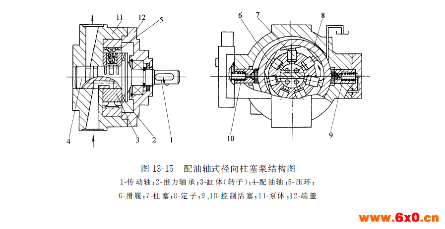 如图13-15所示为配油轴式径向柱塞泵结构图。它主要由传动轴1、缸体(转子)3、配油轴4、滑履6、柱塞7、定子8、控制活塞9和10、泵体11和端盖12等组成。其结构特点如下: