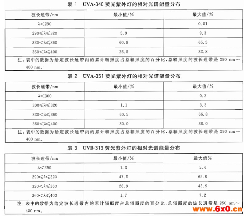 5.1.1本标准应采用荧光紫外灯,荧光紫外灯的辐射主要是紫外线,低于400 nm的辐射占总辐射的80%以上。本标准可以使用三种类型的荧光紫外灯: