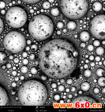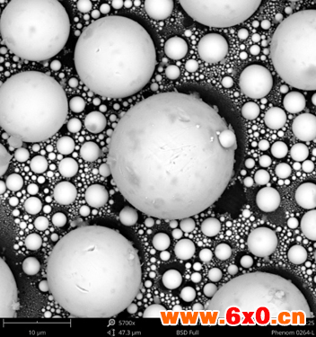 图 1 和图 2 是锡球样品分别在 15kV 和 5kV 同一位置的扫描电镜图像对比。对于 15kV 的图像,尺度越小的锡球拍摄边缘更锐利,分辨率更高,但对于锡球表面的细节信息反应较差;5kV 图像锡球表面的污染物信息表征更明显更真实,但尺度较小的锡球边缘较为模糊,分辨率较差,信号也不如 15kV 充足。