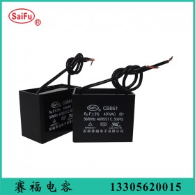 CBB61交流电动机电容器Features 特点•适用于频率为50Hz/60Hz交流电源供电的单相电动机起动和运转•有自愈性•高稳定性,可靠性Applications应用场合•用于空调风机、电风扇、排风扇等频率为50Hz/60Hz交流电源供电功率相对较小的单相电机启动和运行。CBB61风扇电容器采用边缘加厚的金属化锌铝膜作为电极和介质。再在ABS或PB