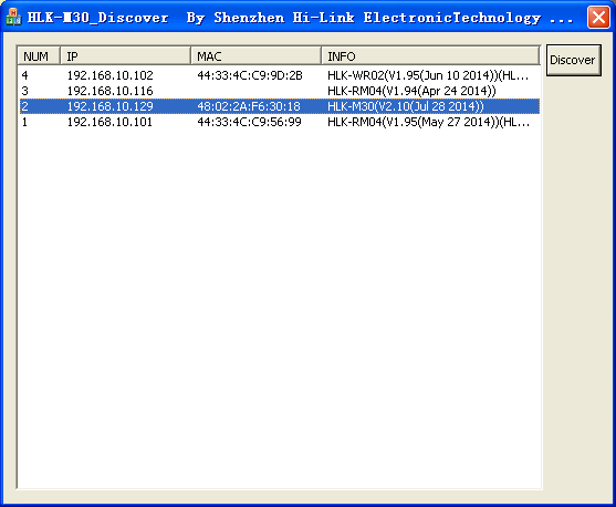 3,将电脑连接无线路由器,然后打开搜索工具HLK-M30_Discover ,点击Discover按钮