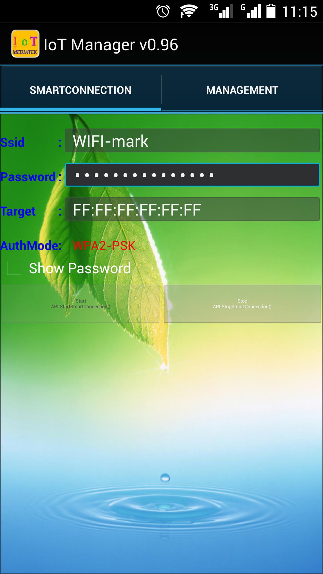2,打开IoTManager,输入需要连接的无线路由器的网络名称(SSID),密码,然后点击Start按钮 ,模块开始自动连接至无线路由器,此时模块的WIFI_LED会快速闪烁。