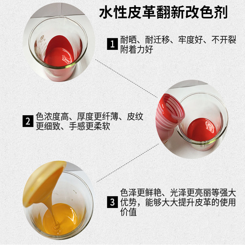 这款产品水性环保,具有优异的附着力、韧性好,不爆裂,抗刮耐磨,使用方便,改色一次成型,无需添加其他树脂。