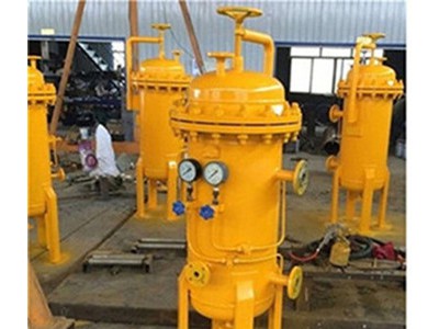 多级过滤器主要由一级旋风分离器、二级惯性除沫器预滤和凝聚、三级精滤芯凝聚、排污阀等组成,夹带液体和固体颗粒的燃气,由进气管以切线方向进入一级旋风分离器。经过旋风分离,较大的液滴和固体颗粒被分离出来。然后,经过二级除沫器,气体通过惯性碰撞作用下,气、液、固进一步分离。气体中粒径较大的尘埃被滤除,对后级精滤芯起保护作用。气体通过精滤芯(第三级精滤),粒径大于10微米(或更细)的固体粒子被滤除;粒径微小的液态雾状物被收集在精滤芯上,并凝聚成较大的液滴,在重力作用下,沉降到精滤管底部。分离出来的液体由各排污口排出,经处理的燃气由过滤器顶端的出气口输出。本装置综合采用机械分离,微纤维过滤和微孔介质凝聚生长的原理,具有相当高的除尘过滤精度及脱湿能力。